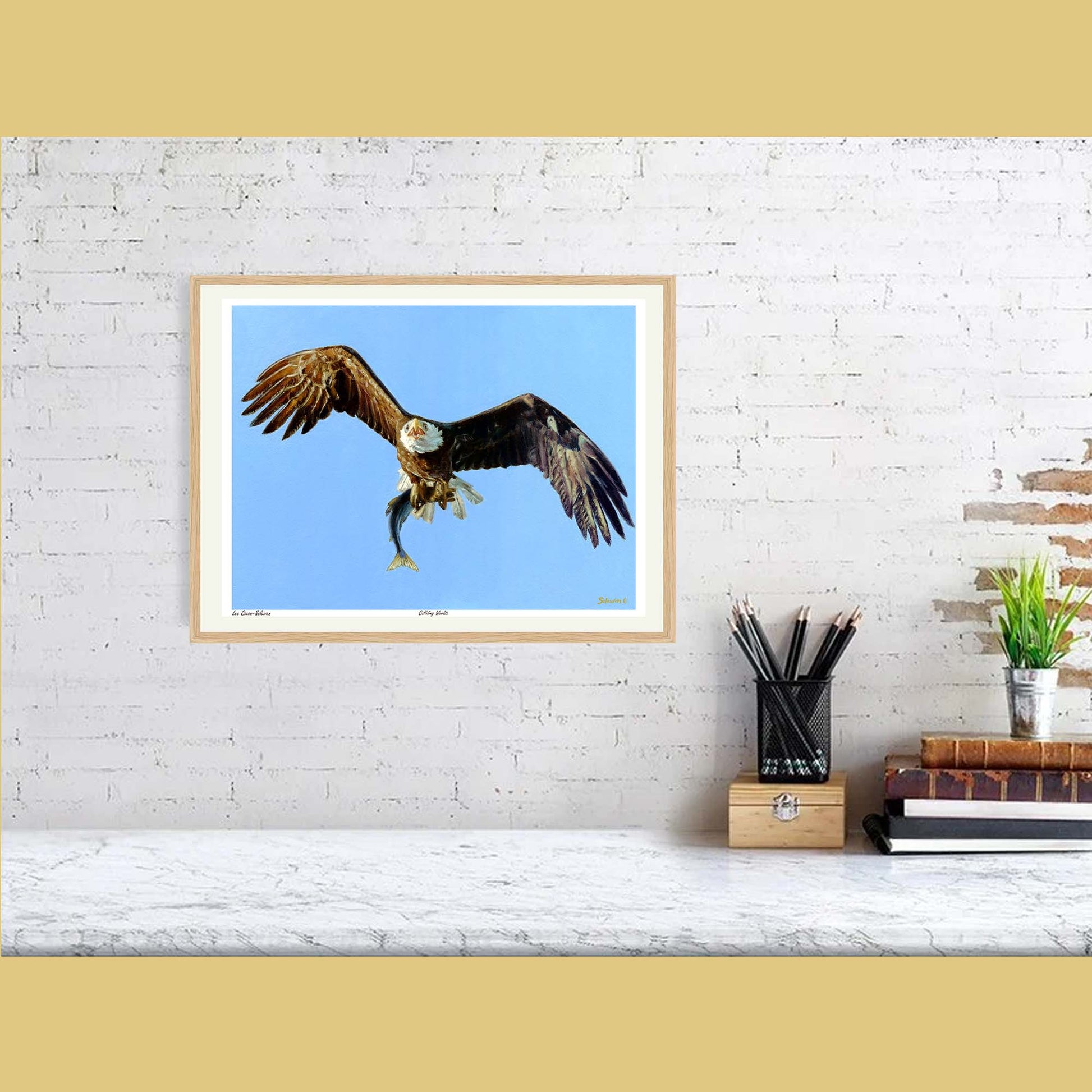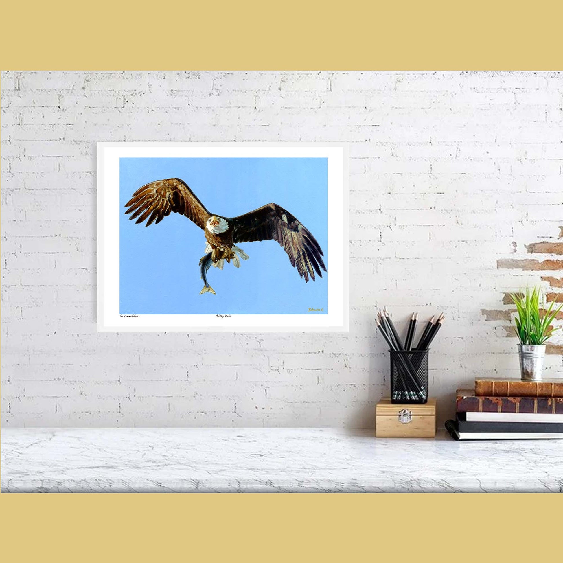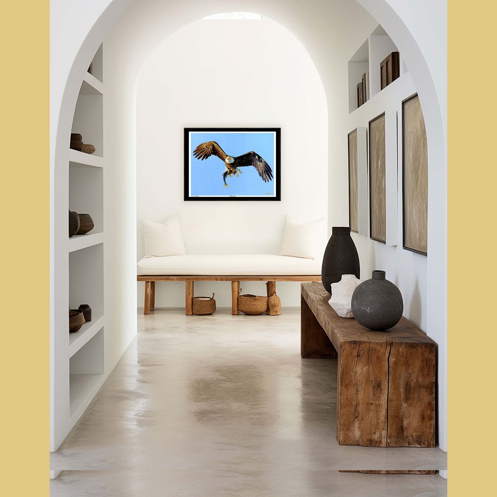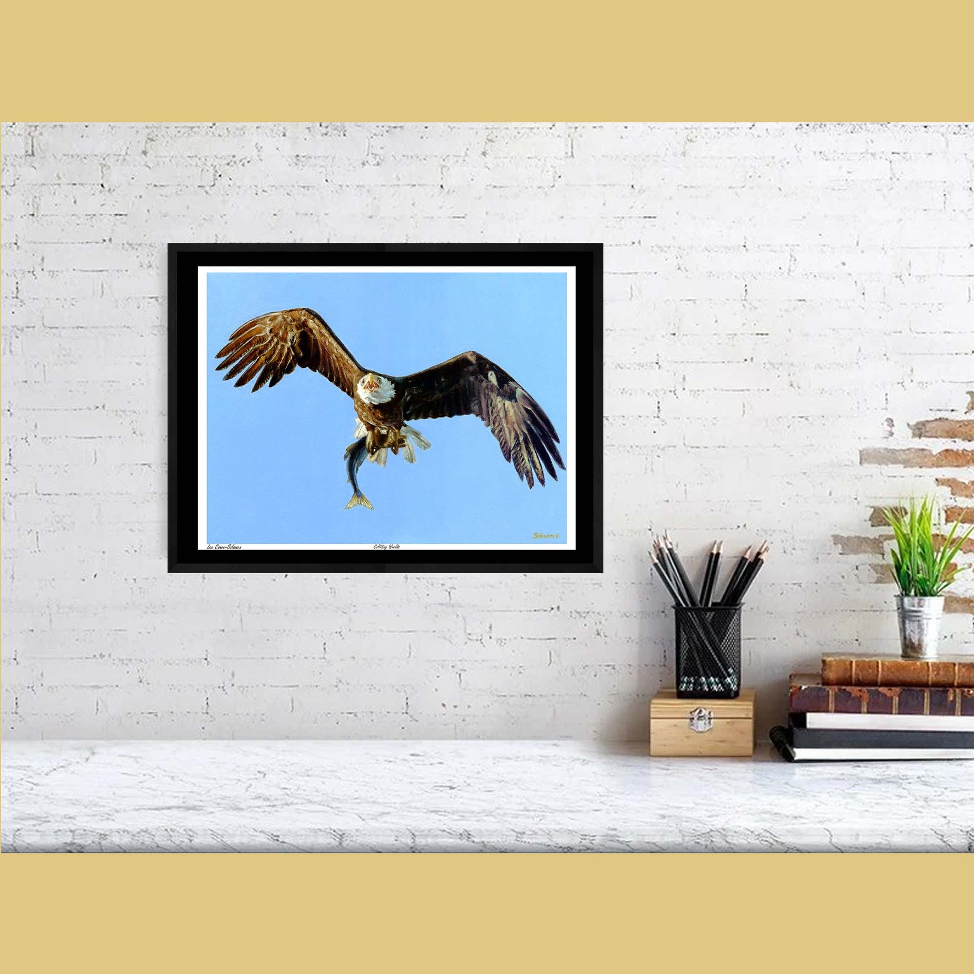 Painted in oil, this piece captures the raw moment when predator and prey collide — the eagle, sovereign of the skies, rising with its catch torn from the deep. It is survival distilled into one image: talons clutching life, wings carving the air, the silent scream of inevitability echoing below.