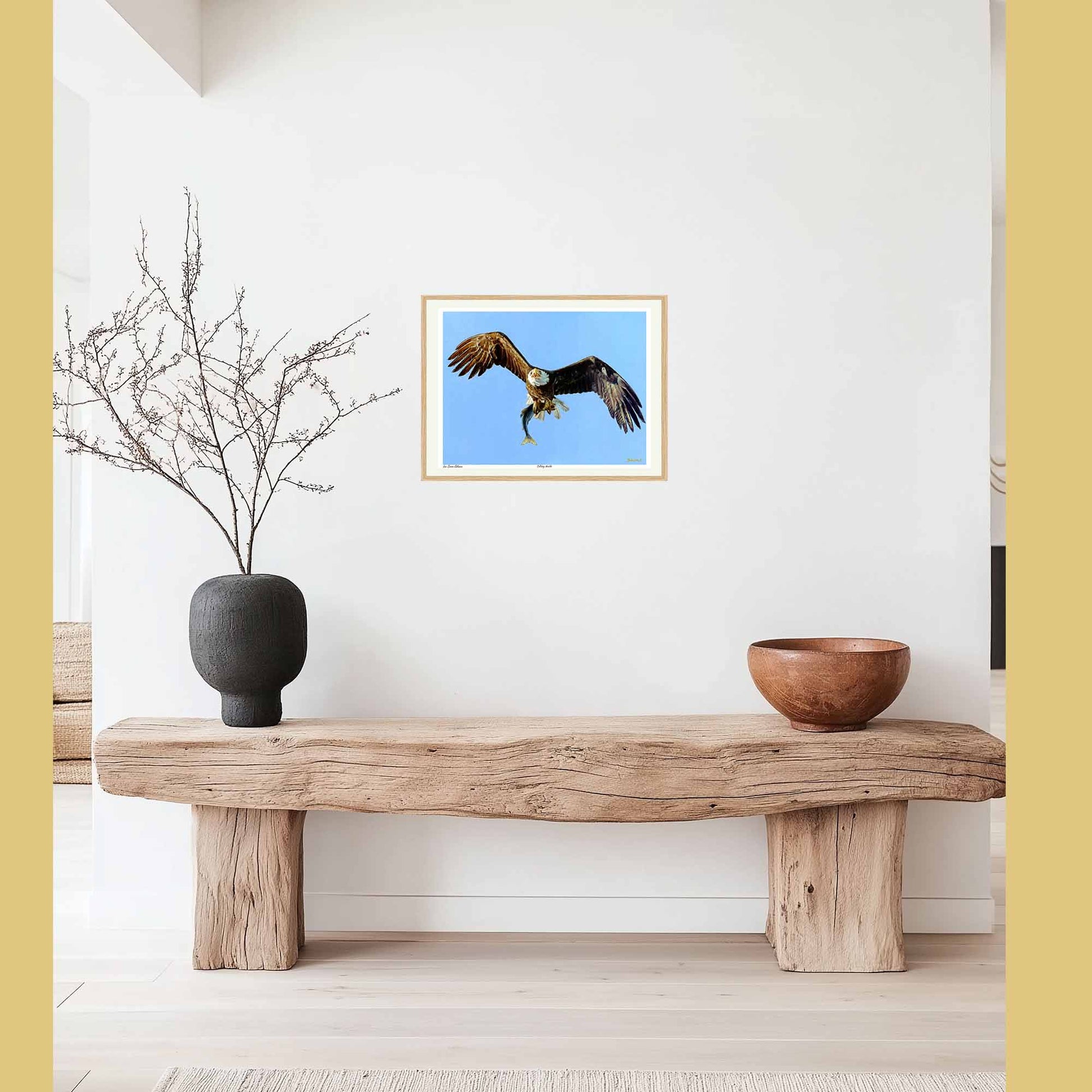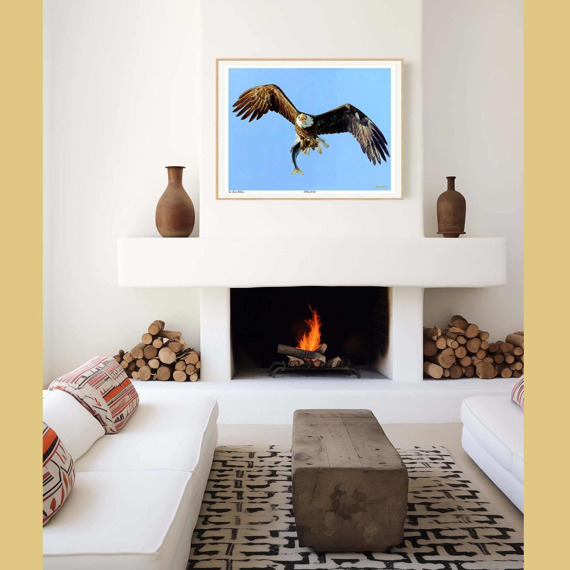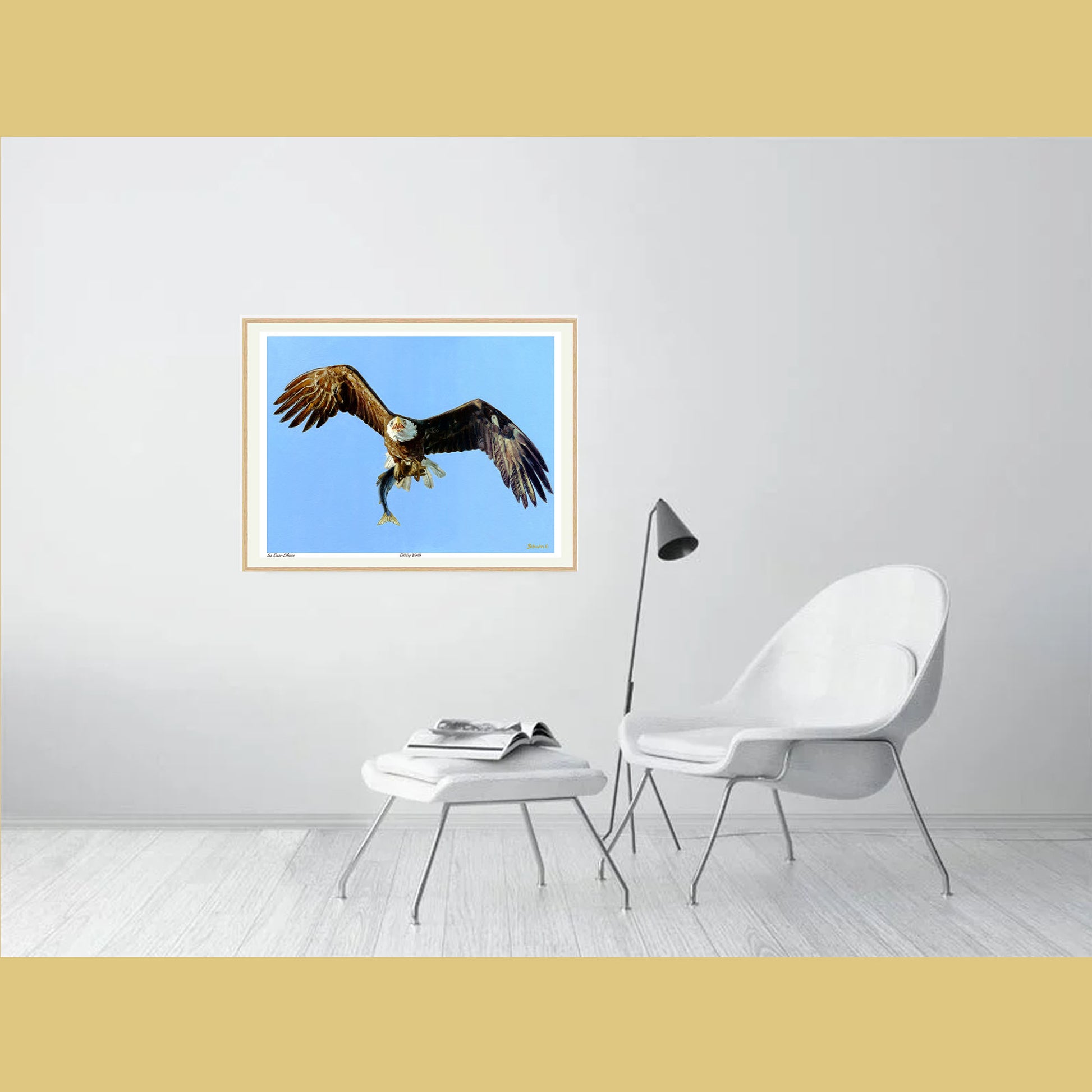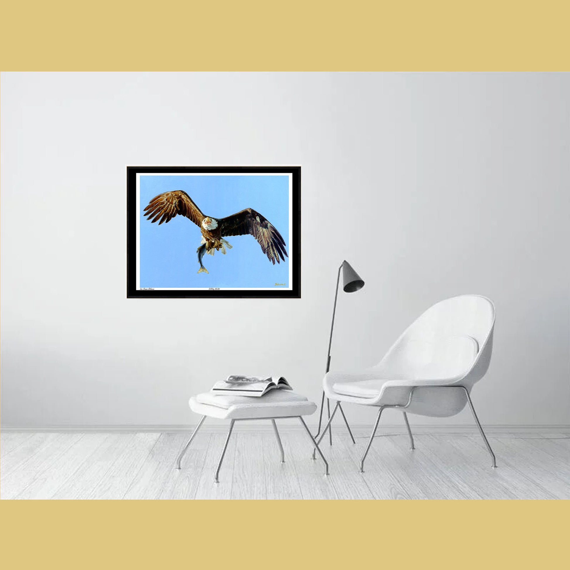 Painted in oil, this piece captures the raw moment when predator and prey collide — the eagle, sovereign of the skies, rising with its catch torn from the deep. It is survival distilled into one image: talons clutching life, wings carving the air, the silent scream of inevitability echoing below.