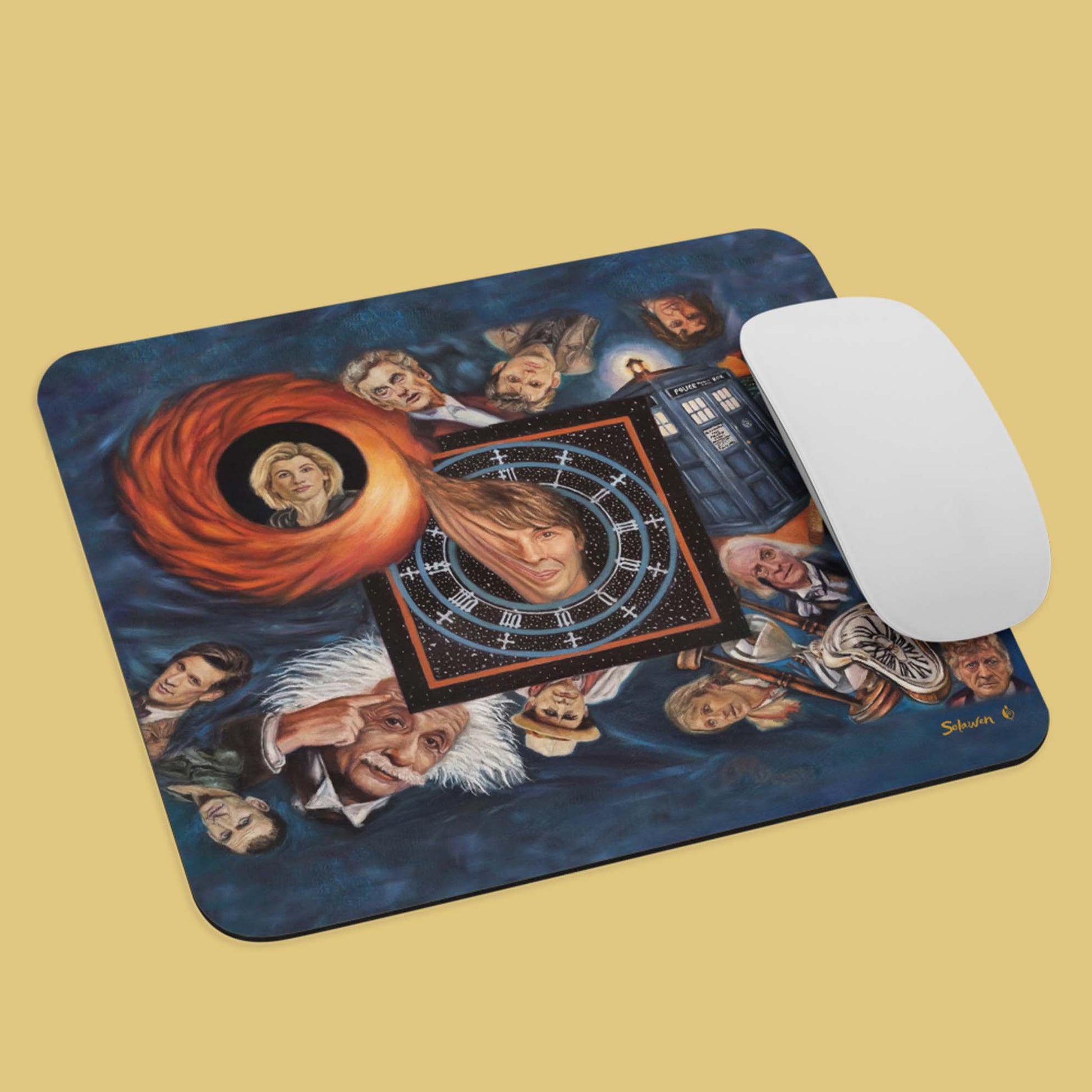 At your desk, time doesn’t just tick — it surges. This mouse pad captures that surge: Doctor Time adrift within swirling currents, faces and echoes from the Infinite always near, always shifting. The artwork becomes both stage and reminder: that in chaos, there is rhythm; in fragments, there is pattern.