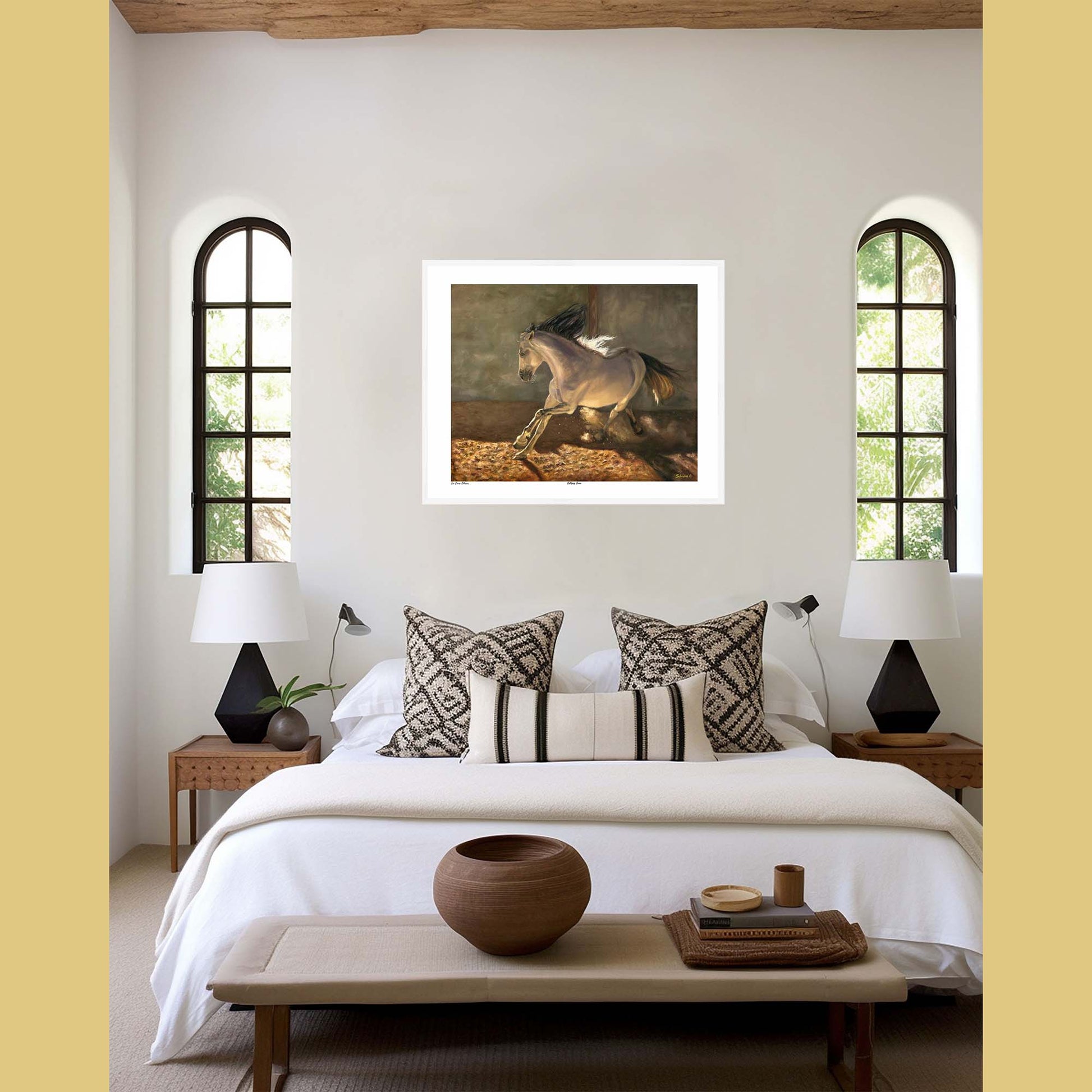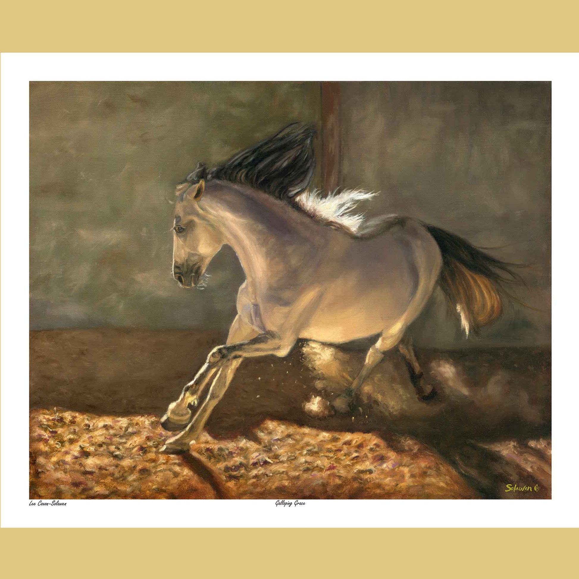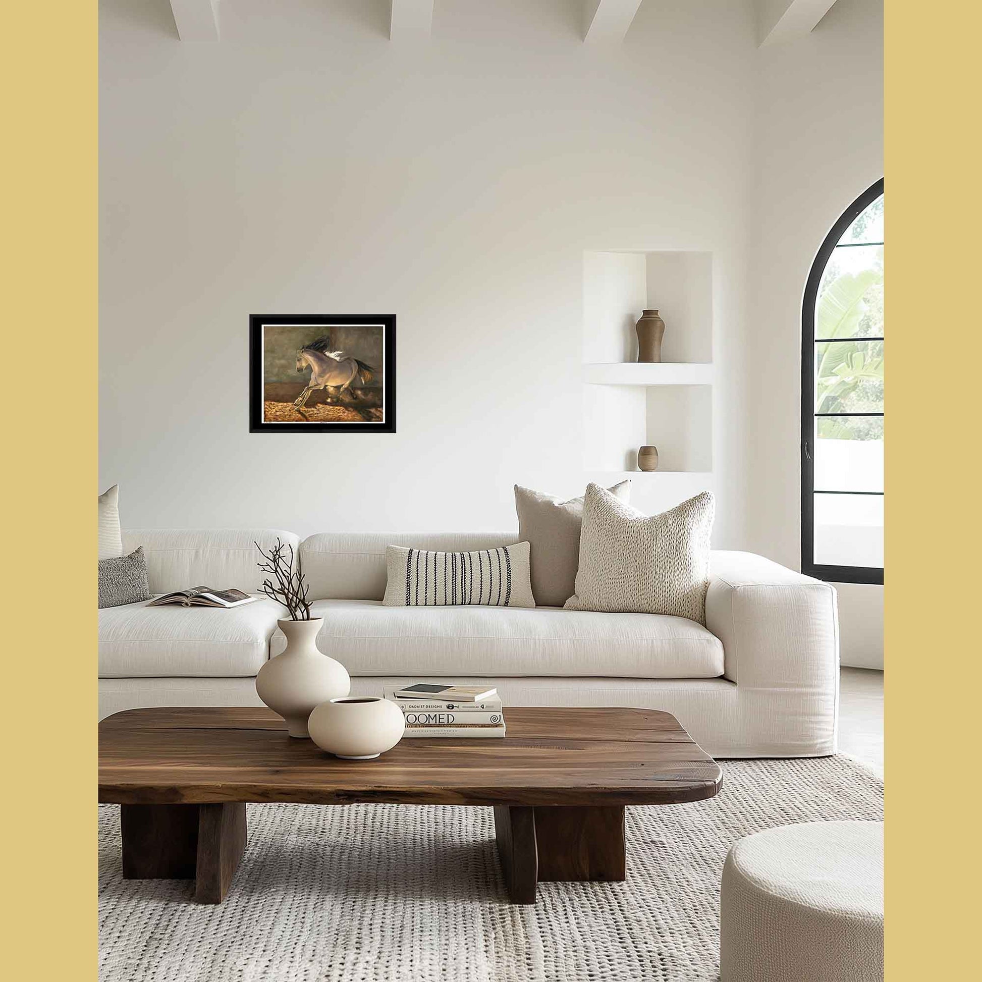 Painted in oil paints, this piece is a study in liberation—the horse unbound, hooves speaking rhythms older than language. Each brushstroke holds motion without hurry: light caught in mane, strength flowing through muscle, the poise of a spirit that refuses fences.