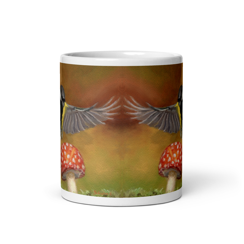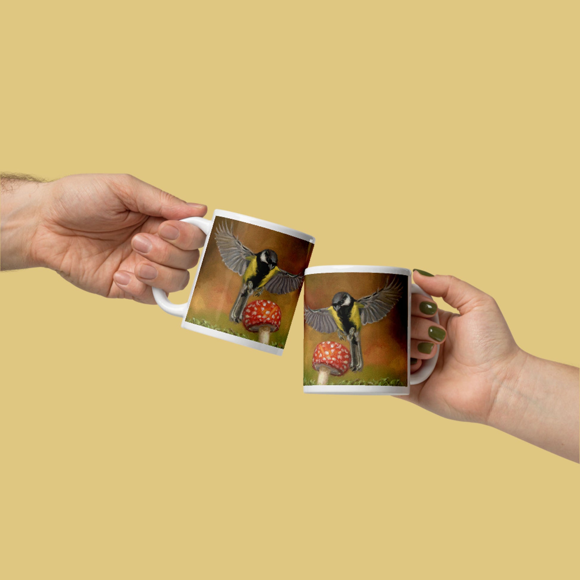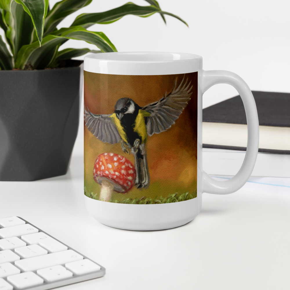 Ceramic mug featuring Perfect Landing — A Moment Suspended, where a bird hovers above a red-capped mushroom. Its wings are stretched wide, frozen in that instant before gravity chooses its path.