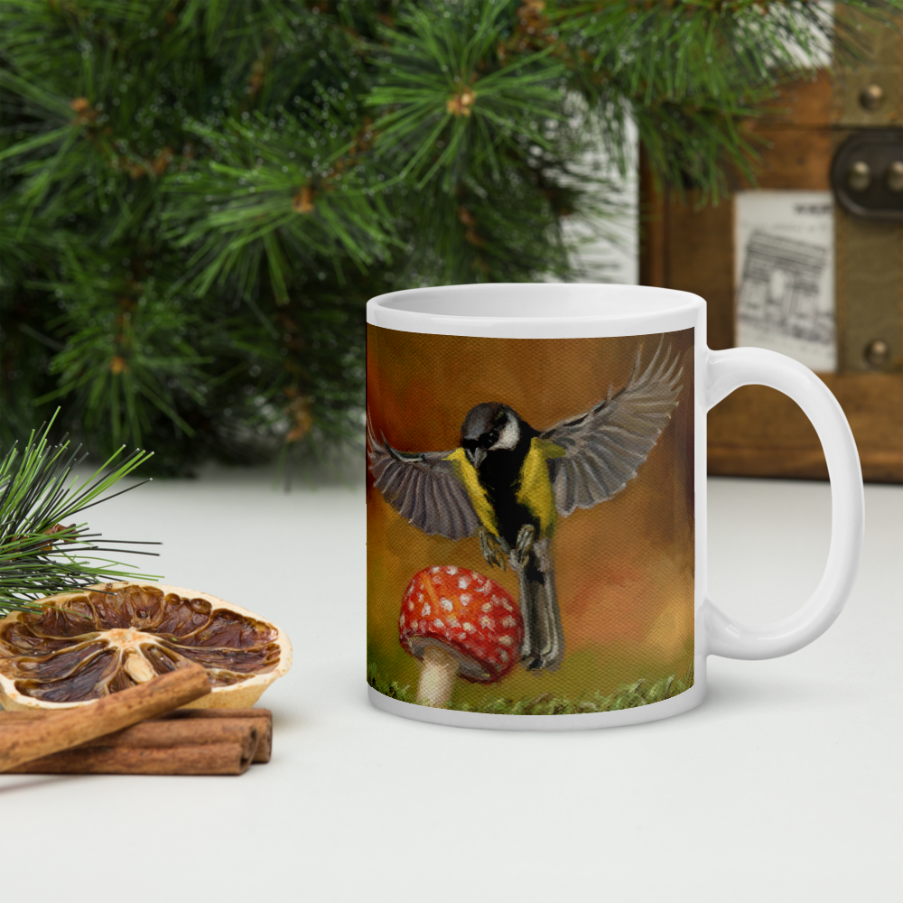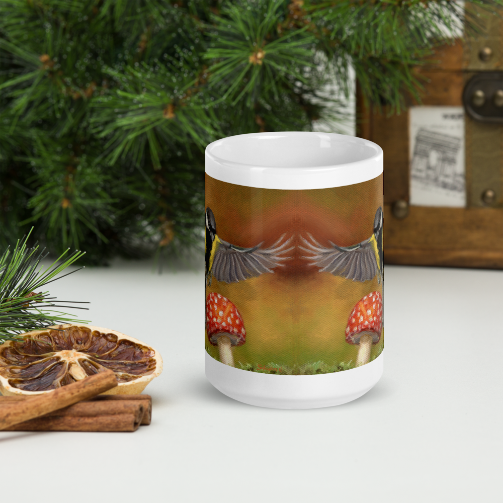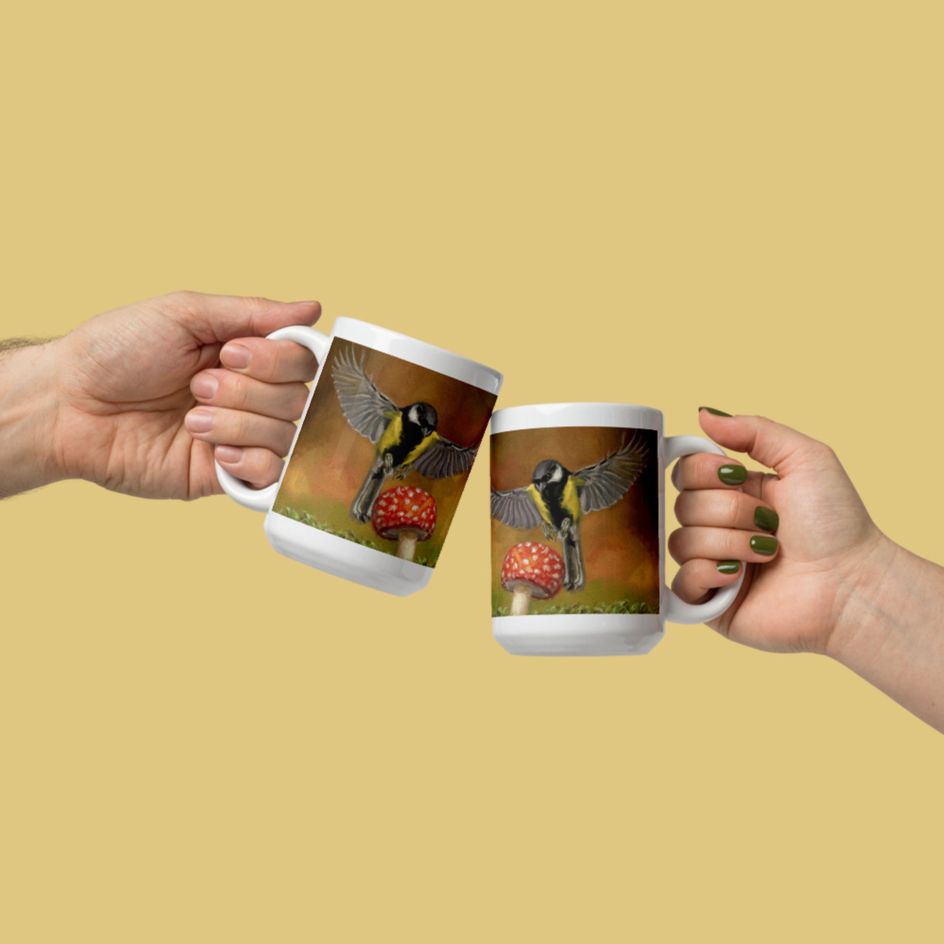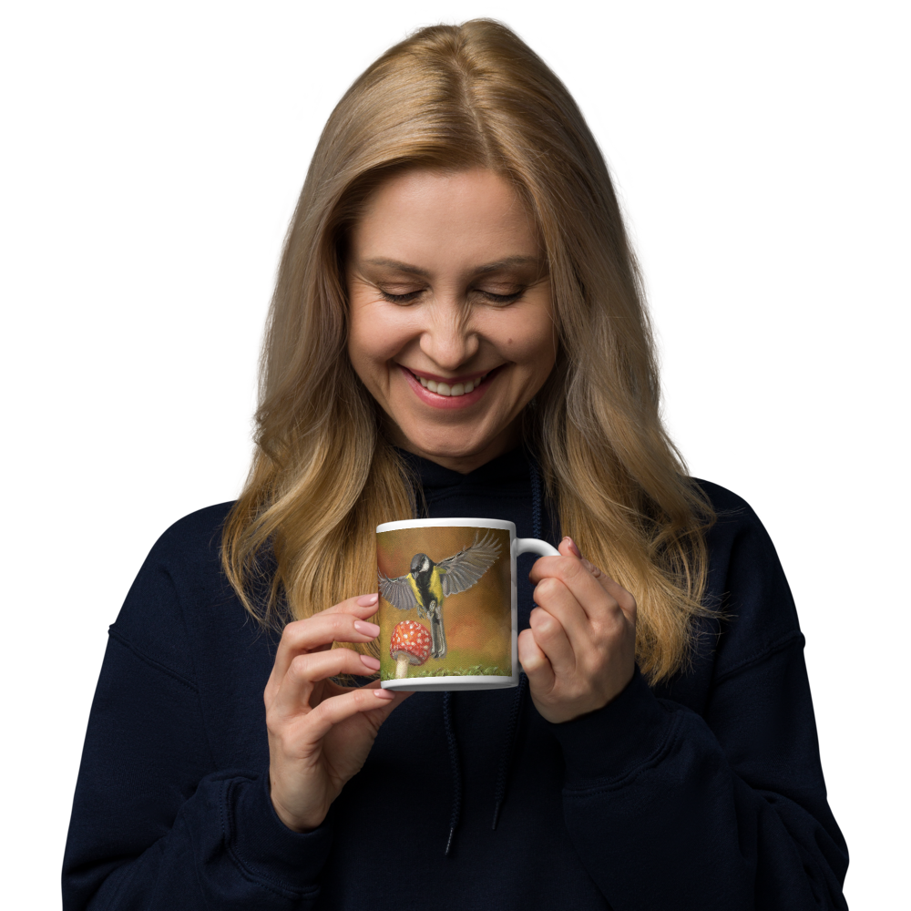 Ceramic mug featuring Perfect Landing — A Moment Suspended, where a bird hovers above a red-capped mushroom. Its wings are stretched wide, frozen in that instant before gravity chooses its path.