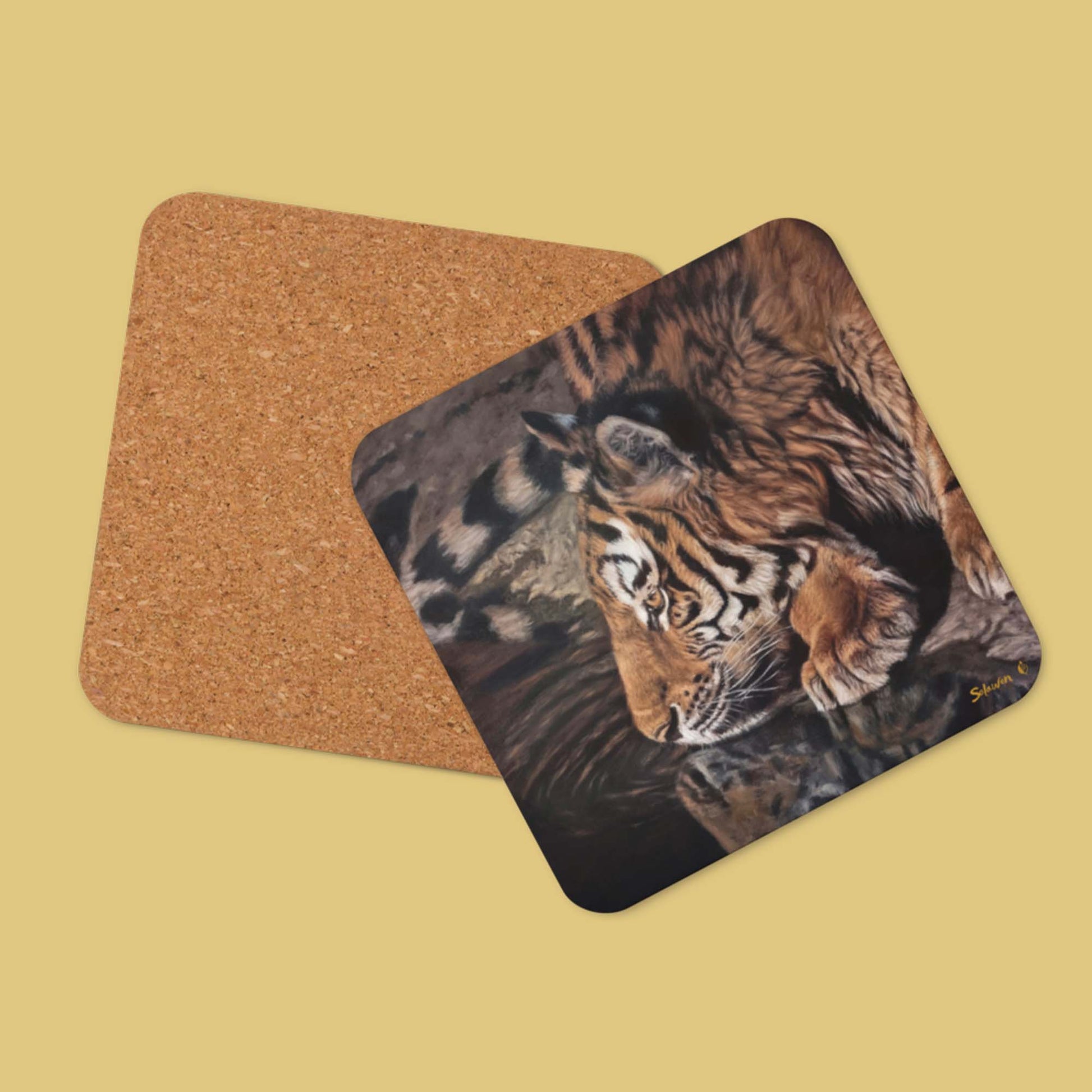Cork-back coaster featuring Reflections of Futures Past — Fragments of Forever, where a tiger kneels by a quiet pond. The predator, normally feared for its power, is caught instead in a rare moment of calm — its reflection shimmering like pieces of memory scattered across the surface.