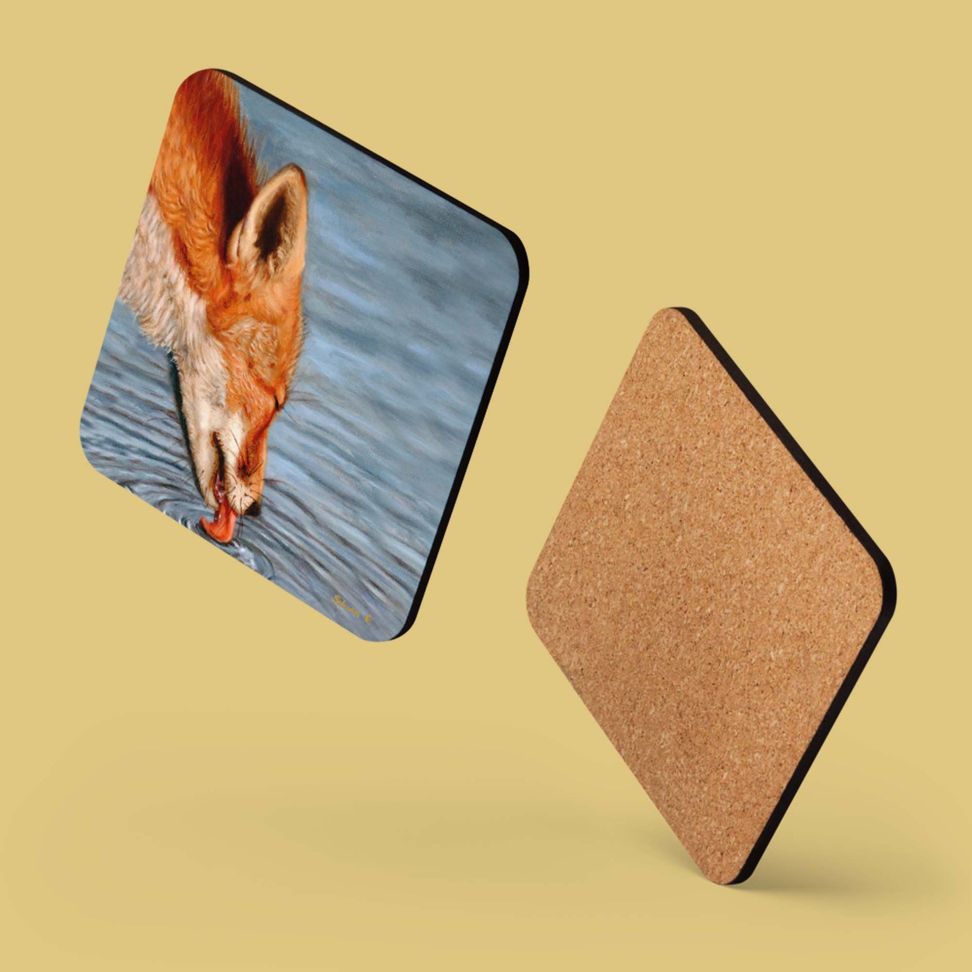 Cork-back coaster featuring Quench — Ripples of Memory, where a fox lowers its head to drink, eyes closed in rare surrender. The water breaks gently around its muzzle, carrying the image outward in soft ripples — as though memory itself has been stirred.